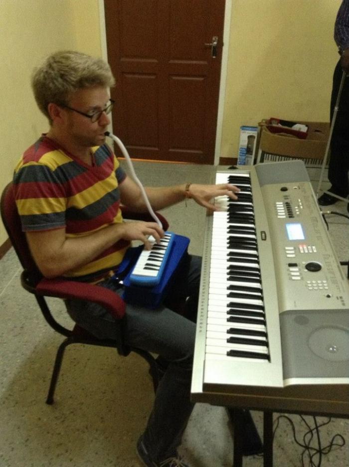 Phil Dunlap rehearses – two keyboards at once!!