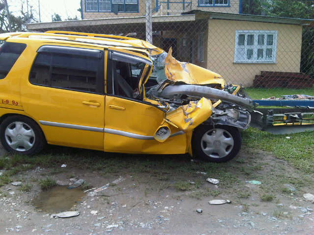 Reports are that around 18 hours 30 A taxi driver lost control of his car, HB 3878 and went overboard after his wheel got stuck in a ridge in the dilapidate concrete structure on Cemetery Road, as a result the Thoms and the taxi driver were trapped until persons in the area came to their Aid.
