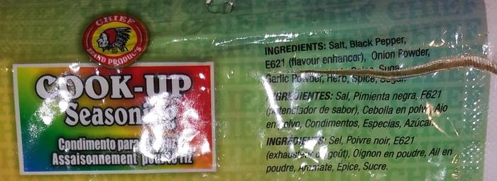 Recently I purchased “cook-up” seasoning under the brand name “Chief” in Maryland, USA. I always check to see if seasonings contain MSG because my experience has been it does produce migraine headaches for me. The list of ingredients made no mention of MSG and so I used the seasoning as directed. A resulting headache made me take a second look at the list of ingredients and research those I did not recognize. Among those ingredients listed was E621 (flavor enhancer), aka MSG. E numbers are codes for substances that are permitted to be used as food additives for use within the European Union and Switzerland (the “E” means Europe).