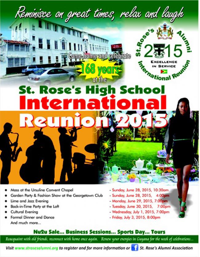 On Friday, July 3 is the finale of the St. Rose’s Alumni International Reunion 2015 with the Closing Ceremony at Parc Rayne, Rahaman Park, EBD at 7:00p.m. This Formal Closing will allow you to reflect on the week’s activities and look forward to upcoming opportunities to get together in our various Chapters and build on our togetherness to enhance the school’s activities. Immediately following the Closing Ceremony there will be the Formal Dinner and Dance at the same location at 8:00p.m. Come see and be seen, eat delicious food and mingle, chat and dance as we wind down from a week of re-acquaintance and reflection. Make contacts to continue to support the work of the school and leave to return to your various ports refreshed by your time together.