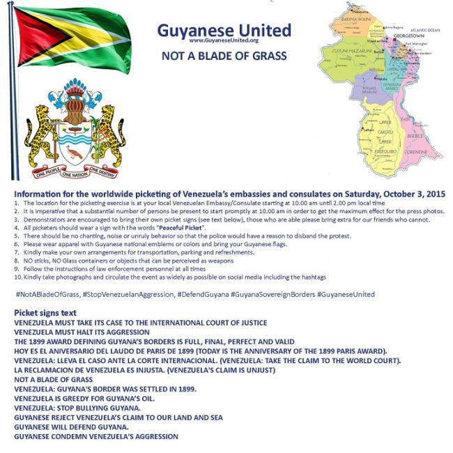 Guyanese around the world have been asked by Guyanese United to stage picketing outside their local Venezuelan embassies and consulates on the116th anniversary of the 1899 award that settled all borders between Guyana and Venezuela.